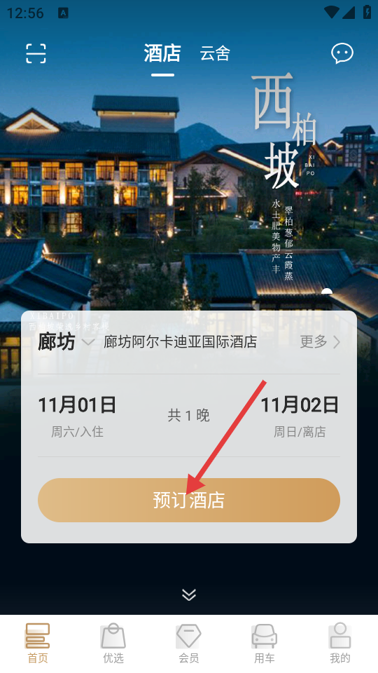2、在首页中,选择入住离店日期后,点击【预订酒店】按钮以进入酒店列表页面。