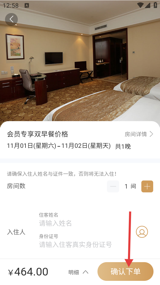 4、在房间详情及订单填写页面中,填写入住人信息后,点击【确认下单】按钮可完成酒店预订操作。