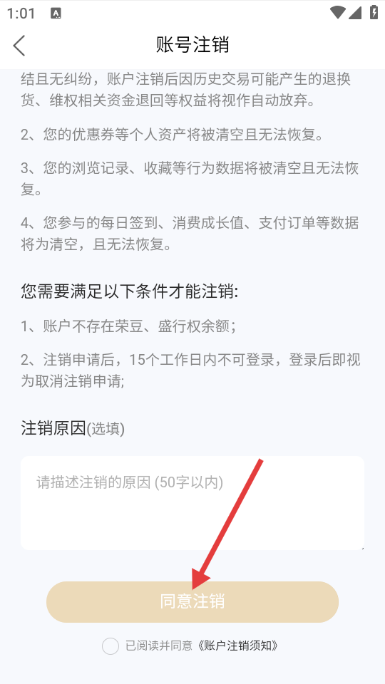 4、在账号注销说明页面中,阅读注销条件及须知后,填写注销原因并点击【同意注销】按钮可完成账号注销操作。