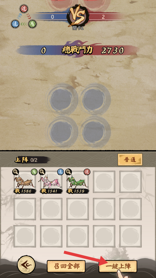 2、点击【一键上阵】,部署螳螂队伍,提升总战斗力,为战斗做好准备。
