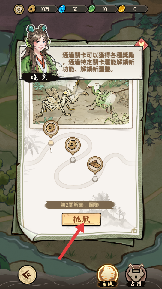 1、点击【挑战】,进入关卡,通过关卡获取奖励,解锁新功能和图鉴。