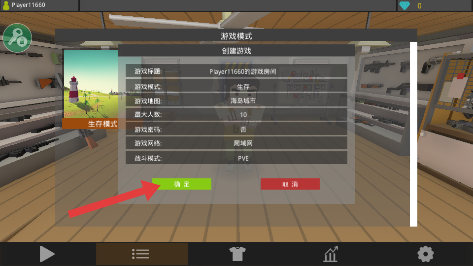 1、在游戏模式界面,选择【生存】模式、【海岛城市】地图等设置后,点击【确定】创建游戏房间。