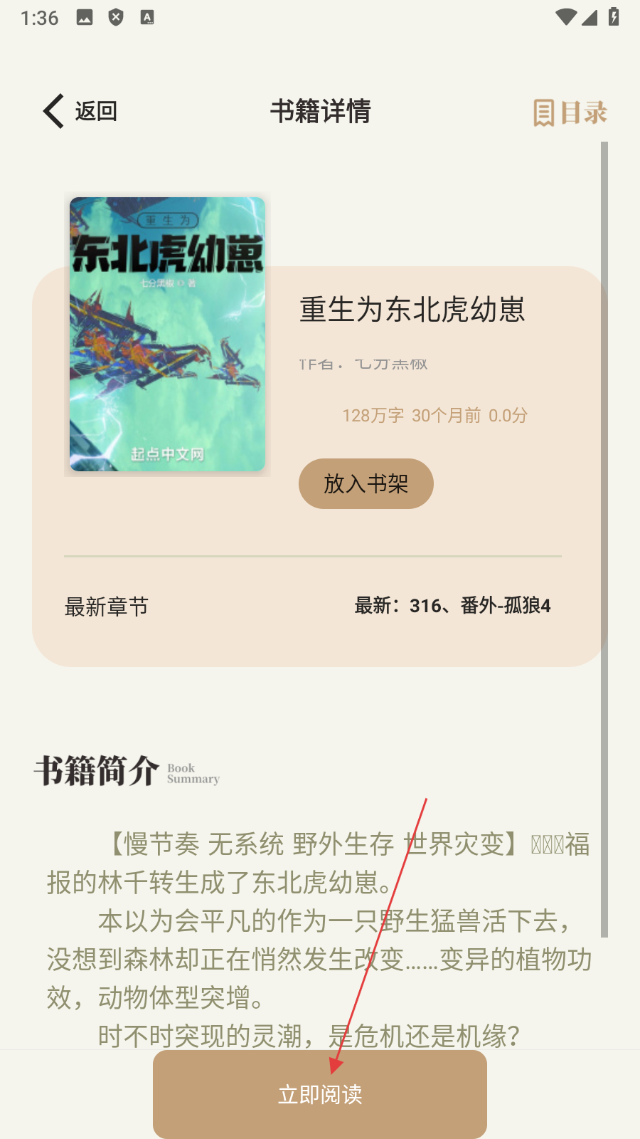 4、在书籍详情页面,点击【立即阅读】,即可开始阅读书籍内容。