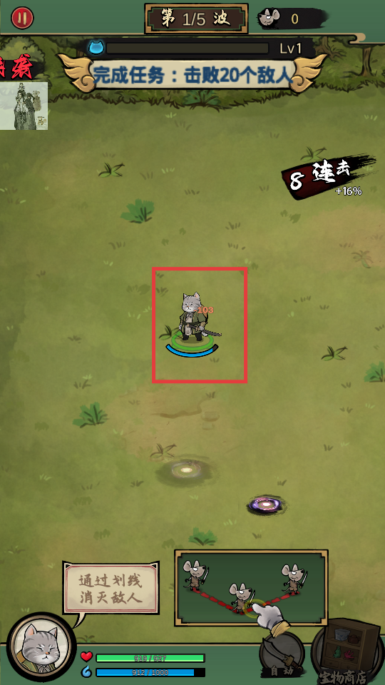 2、按照指引画线穿过敌人,对老鼠敌人进行攻击,完成战斗。
