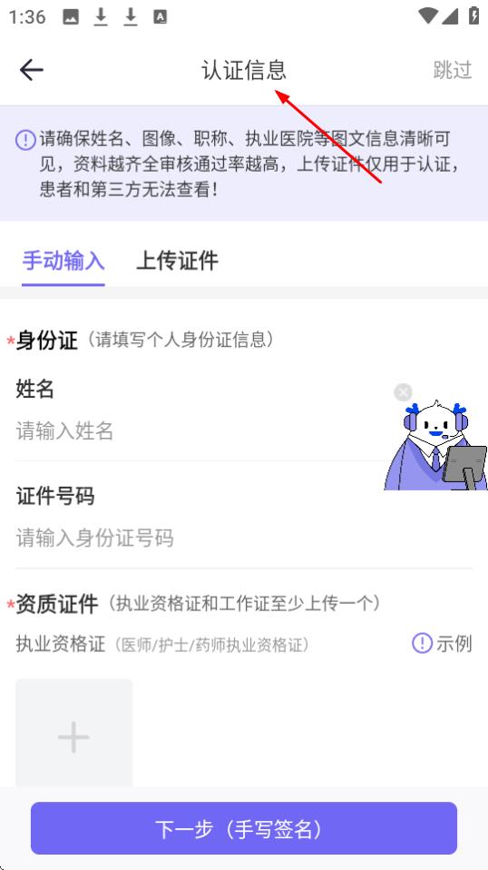 4、在【认证信息】页面,填写【身份证】的姓名、证件号码,上传【资质证件】,点击【下一步(手写签名)】完成认证。