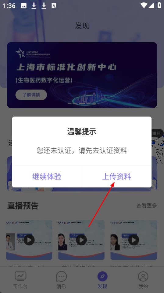 3、若收到【温馨提示】未认证,点击【上传资料】去认证资料。