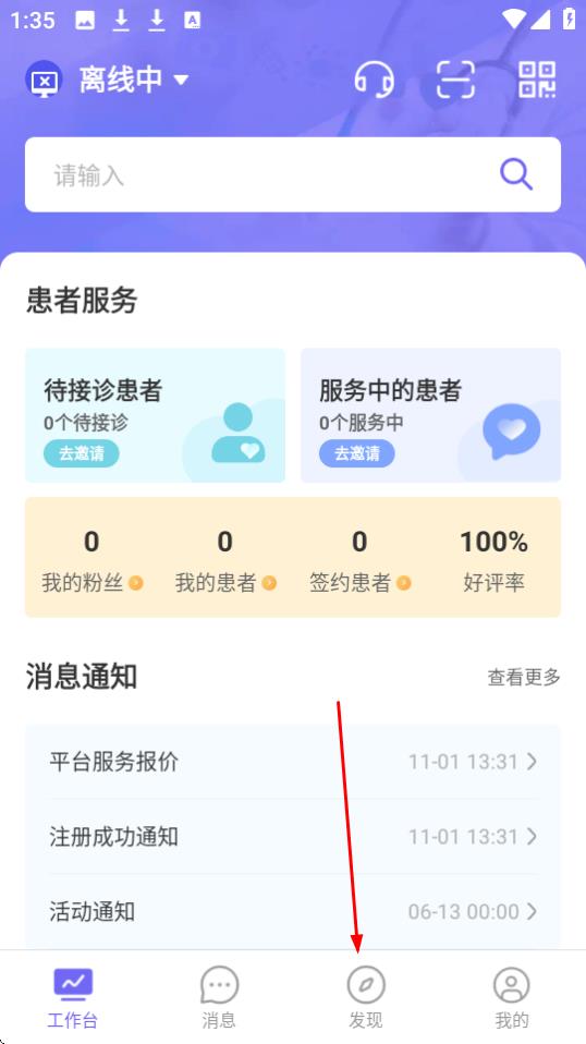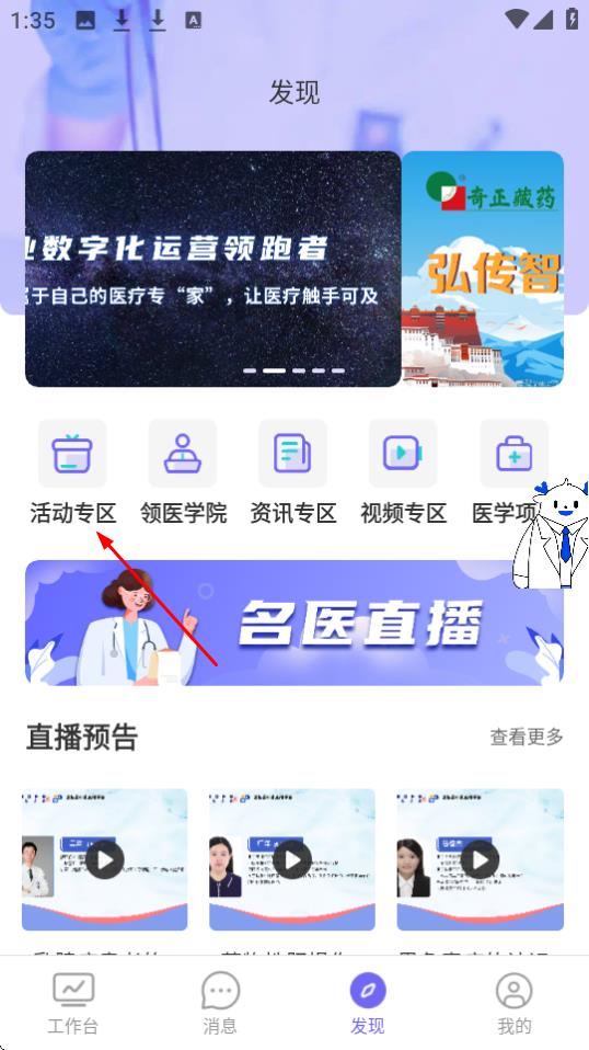 1、在工作台页面,点击【发现】可进入发现页查看各类专区和直播预告等内容。