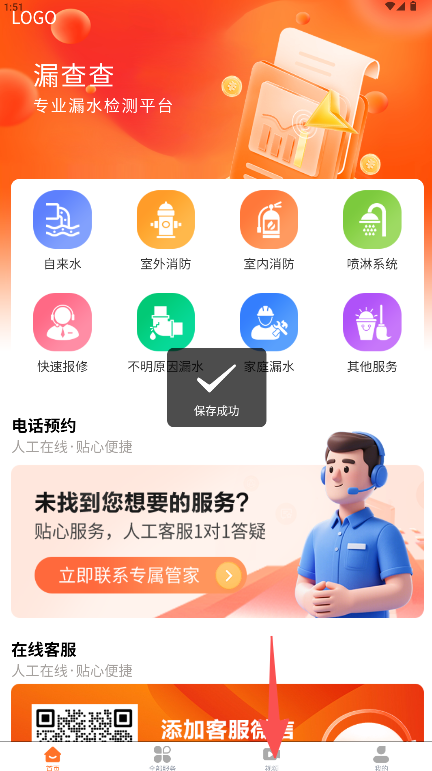 《漏查查》是一款专业漏水检测服务平台。界面以橙色为主色调,顶部明确标注平台定位。核心功能区清晰划分自来水、室内消防、喷淋系统、快速报修等八大服务类别,覆盖多种漏水检测场景。中部设有电话预约板块,提供人工在线答疑服务,软件将专业检测项目与便捷的客服系统结合,通过明确的分类指引和多重沟通渠道,为用户提供高效、专业的漏水检测解决方案。