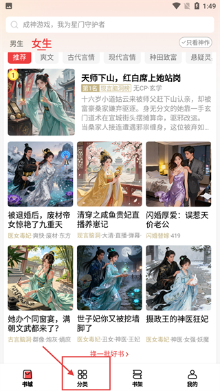 1、在书城界面,点击底部【分类】按钮,可进入小说分类界面。