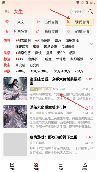 2、在分类界面,选择【现代言情】分类,可查看该分类下的小说列表。