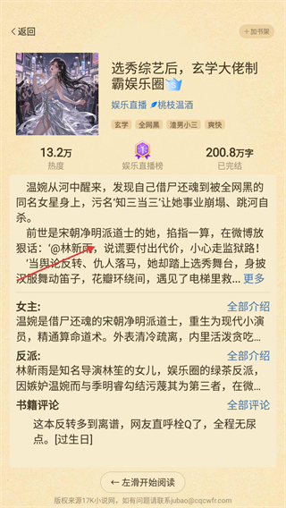 3、在小说列表中,点击感兴趣的小说,如《选秀综艺后,玄学大佬制霸娱乐圈》,可进入小说详情界面。