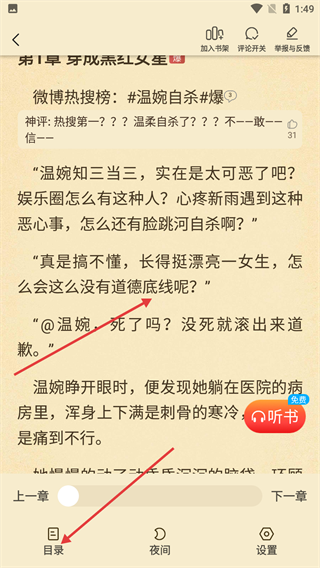 4、点击可进入阅读界面,左滑或点击底部【目录】可切换章节,还可使用听书功能,方便多种场景阅读。