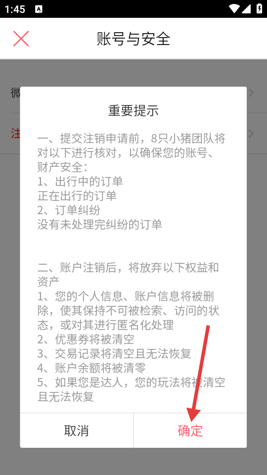 4、在重要提示弹窗中,阅读账号注销的核对要求及权益放弃说明后,点击【确定】按钮可完成账号注销操作。