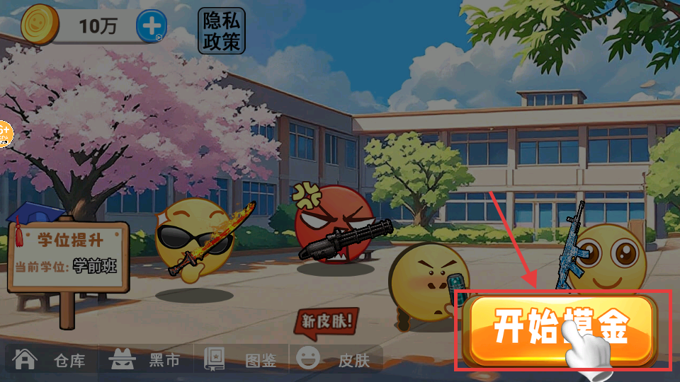 1、点击【开始摸金】进入校园,探索高资源区,收集装备,躲避攻击,撤离换钱。