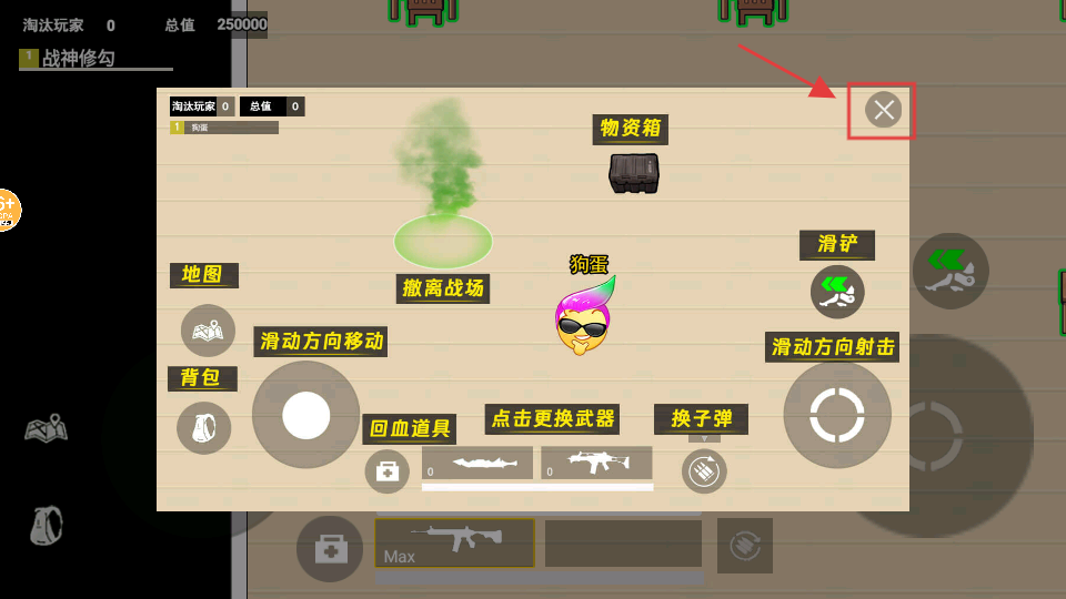 2、关闭界面提示,熟悉【地图】【背包】,利用【物资箱】获装备,牢记【撤离战场】,滑动操作战斗移动。