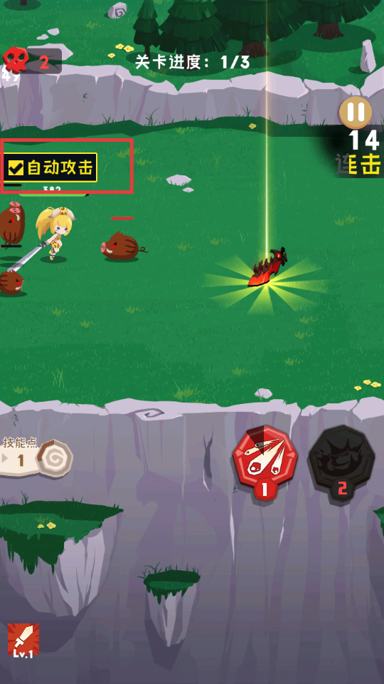 2、使用右下方技能键,消灭敌人,推进关卡进度。