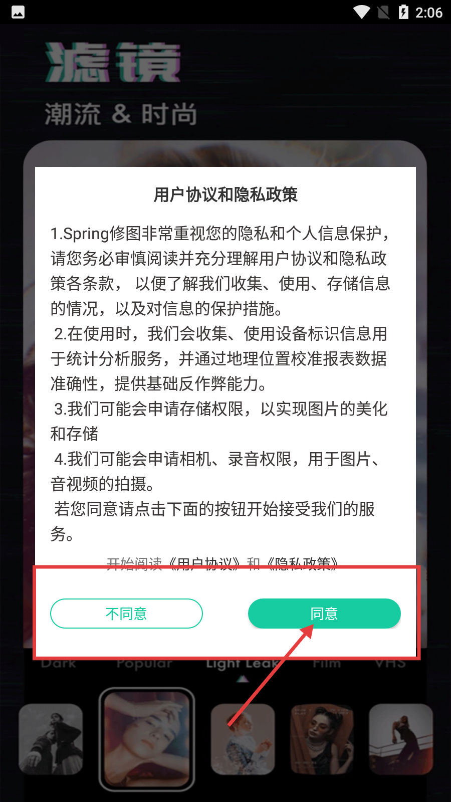 1、在Spring修图的用户协议和隐私政策界面,点击【同意】按钮,可进入功能选择界面。