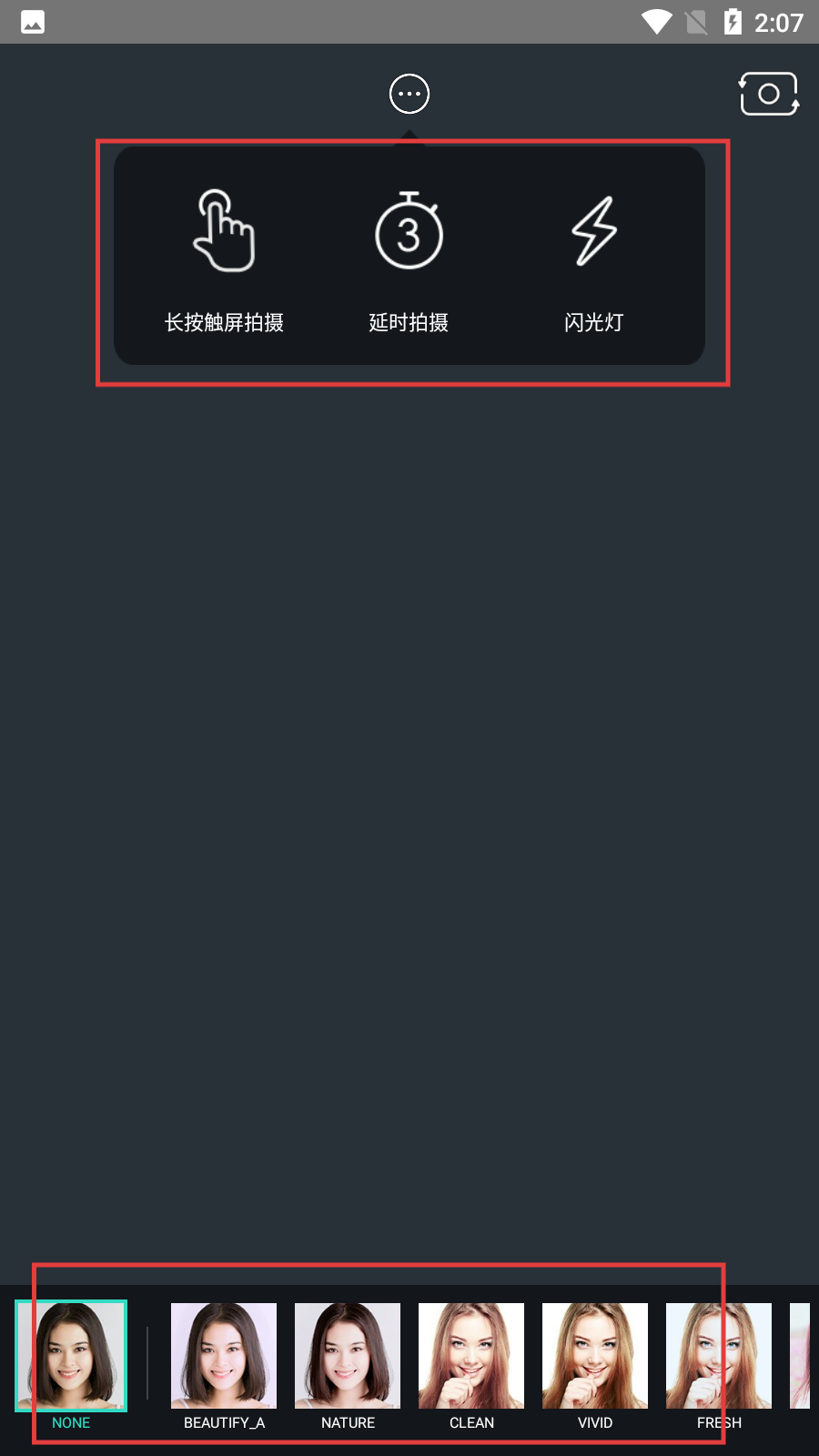 4、选择长按触屏拍摄、延时拍摄、闪光灯等拍摄模式,以及多种美颜滤镜效果,满足不同拍摄需求。