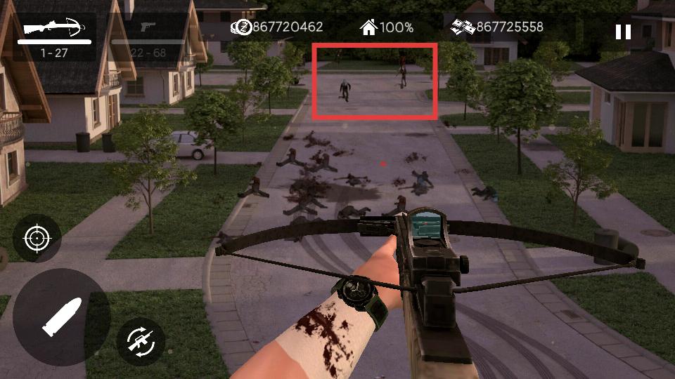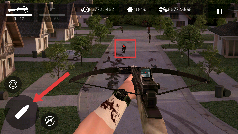 3、准心瞄准僵尸后,点击【左侧弹药】图标,发射弩箭攻击僵尸。