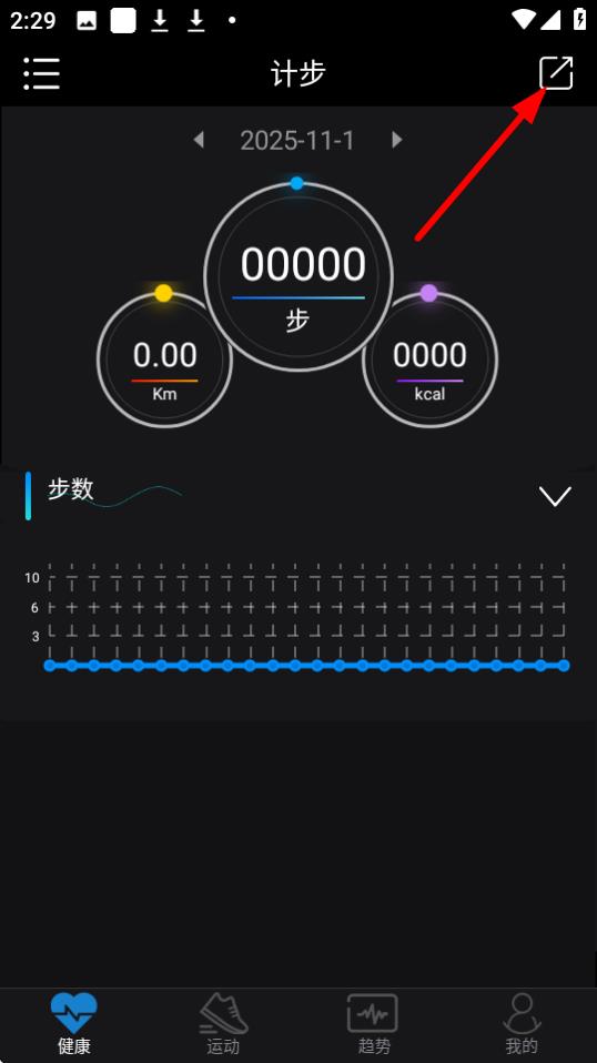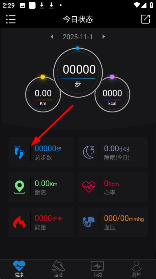 2、在今日状态页面,点击【00000步总步数】区域,可查看步数详情。