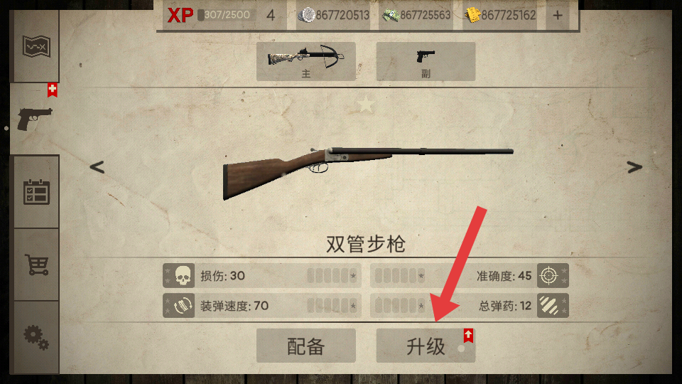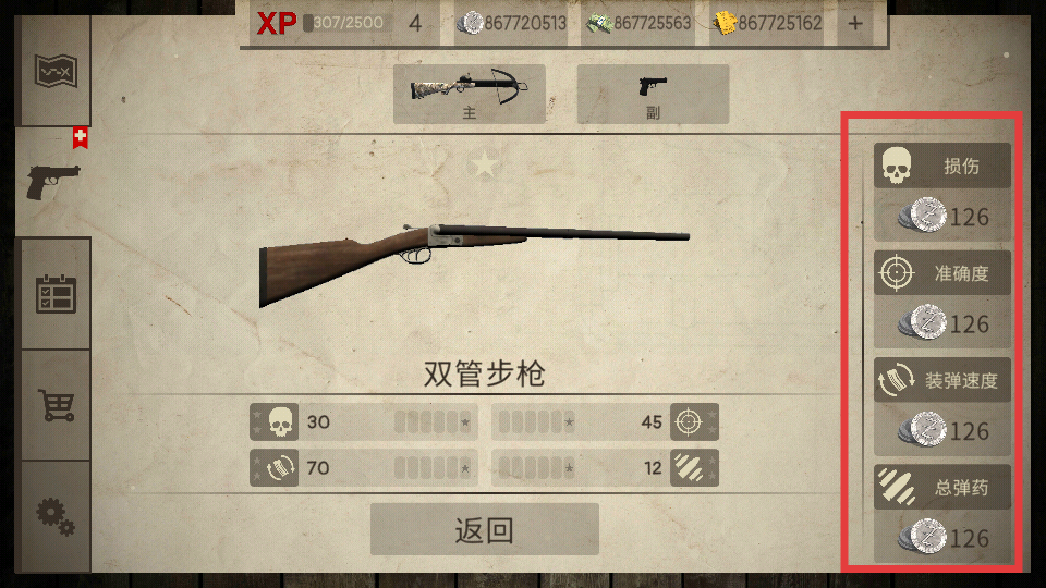 4、在升级界面里,花费【银币】将武器的【损伤】【准确度】【装弹速度】【总弹药】属性全部进行提升,增强战斗能力。