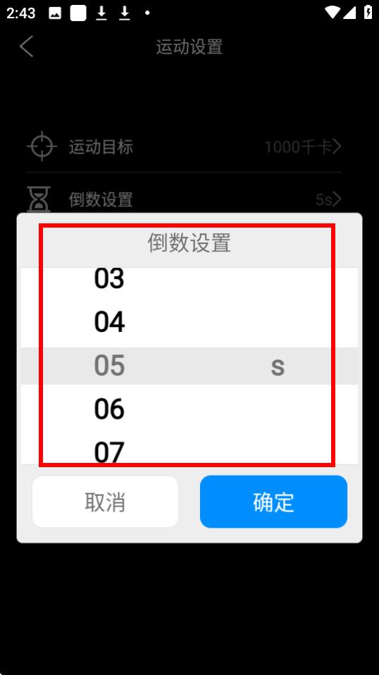 4、在【倒数设置】弹窗中,可选择3、4、5、6、7秒,选好后点【确定】即可设置运动倒数时间。
