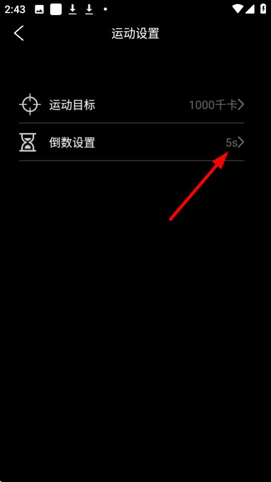 3、在【运动设置】中,点击【倒数设置】右侧的“5s”可进入倒数时间选择界面。