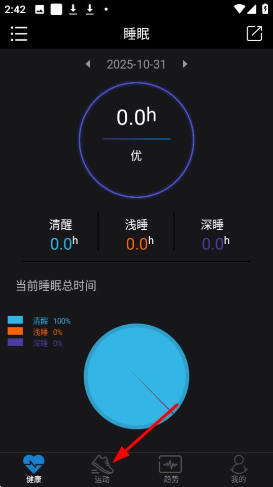 1、在应用底部导航栏,点击【运动】选项可进入运动页面查看行走距离等运动数据。