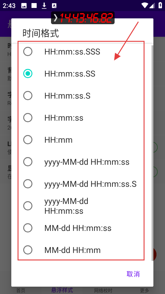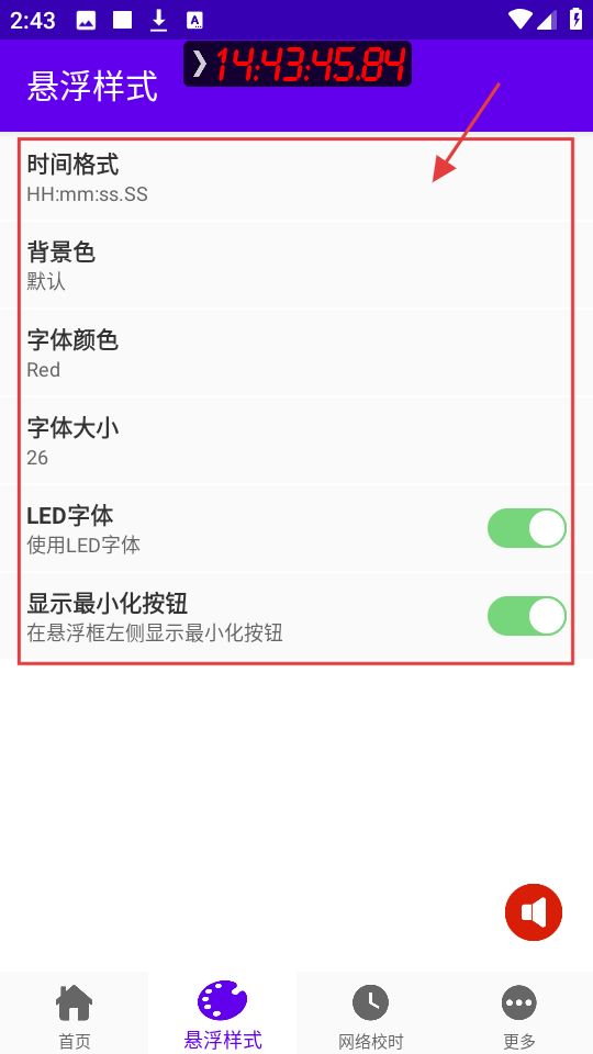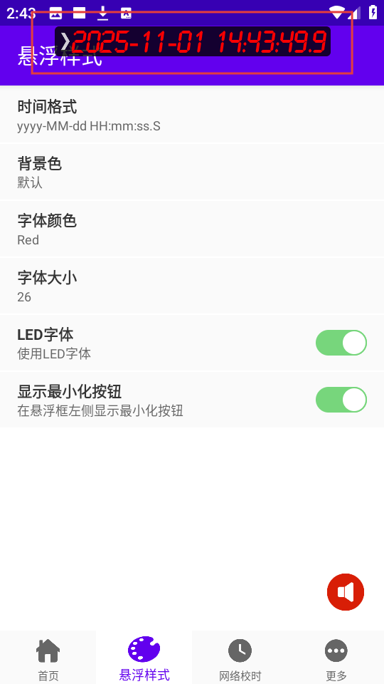 1、在悬浮样式页面,可查看并调整时间格式、背景色、字体颜色等悬浮样式设置,打造个性化悬浮时间显示啦。