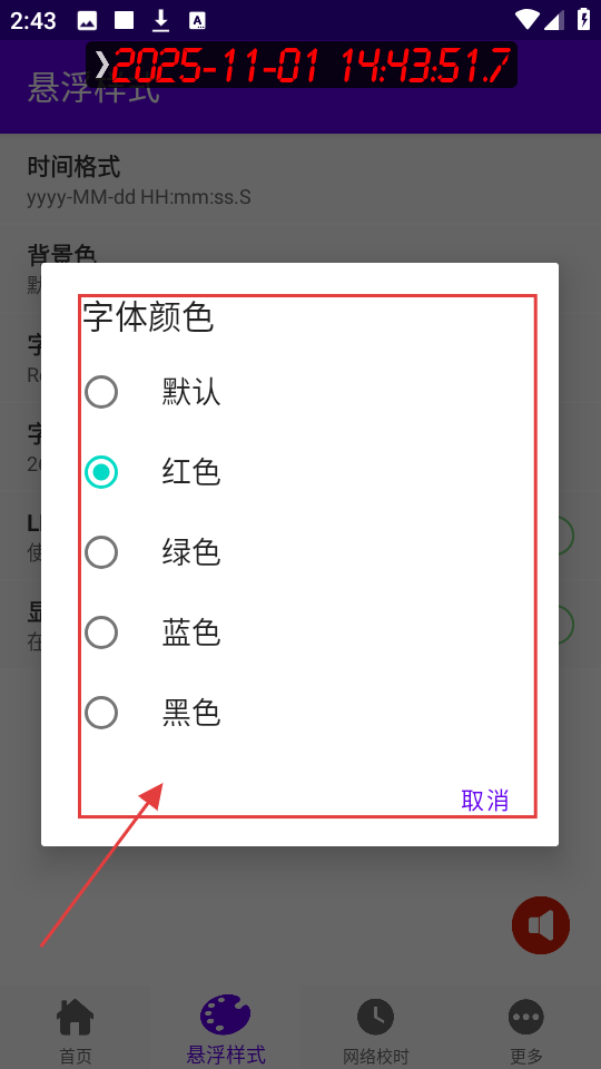 4、点击【字体颜色】,可选择红色、绿色、蓝色、黑色等字体颜色,调整悬浮时间的字体颜色,让显示更醒目哦。