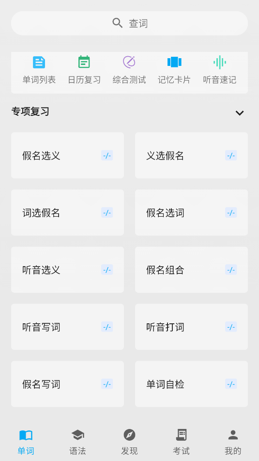 1、打开APP,可在单词界面,查看日语单词列表,综合测试,听力速记等。