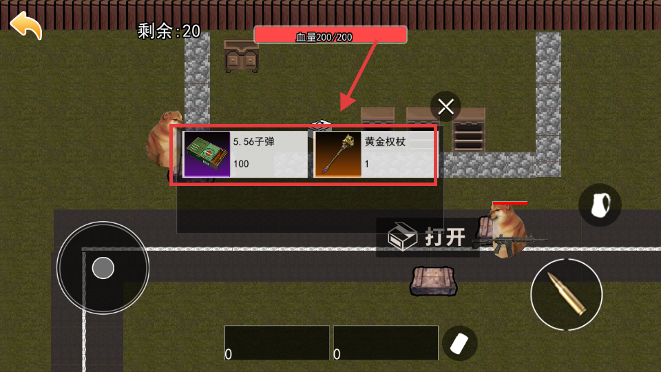 2、打开箱子后可获取【5.56子弹】100发和【黄金权杖】1个,子弹用于射击,权杖或有特殊能力,记得收集增强战力。