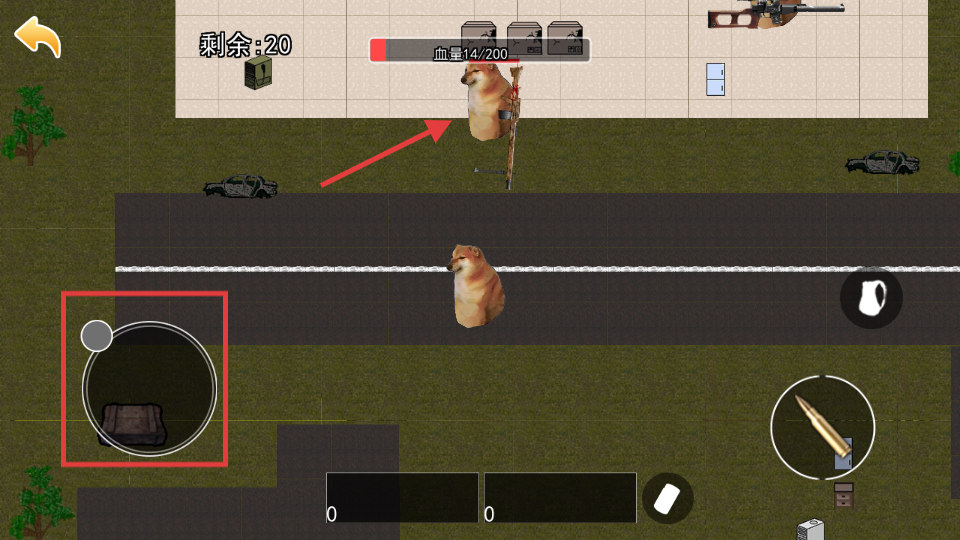 3、使用左侧摇杆控制角色移动,注意上方血量【14/200】,遇敌方狗子时灵活走位,躲避或攻击以存活突围。