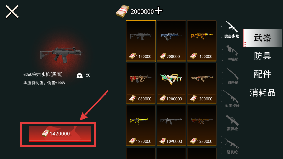 1、攒够【1420000】资金,优先购买【G36C-突击步枪[黑鹰]】,其伤害加百分百,强化战斗输出。