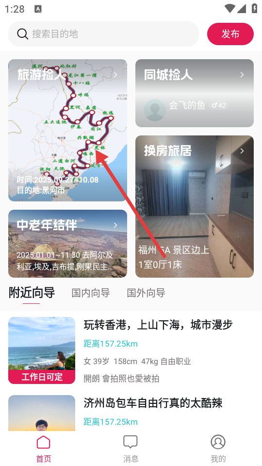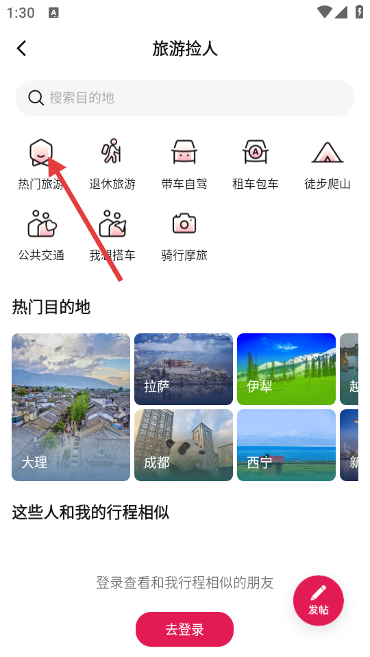 2、在首页中,点击【旅游捡人】板块,进入旅游捡人页面。