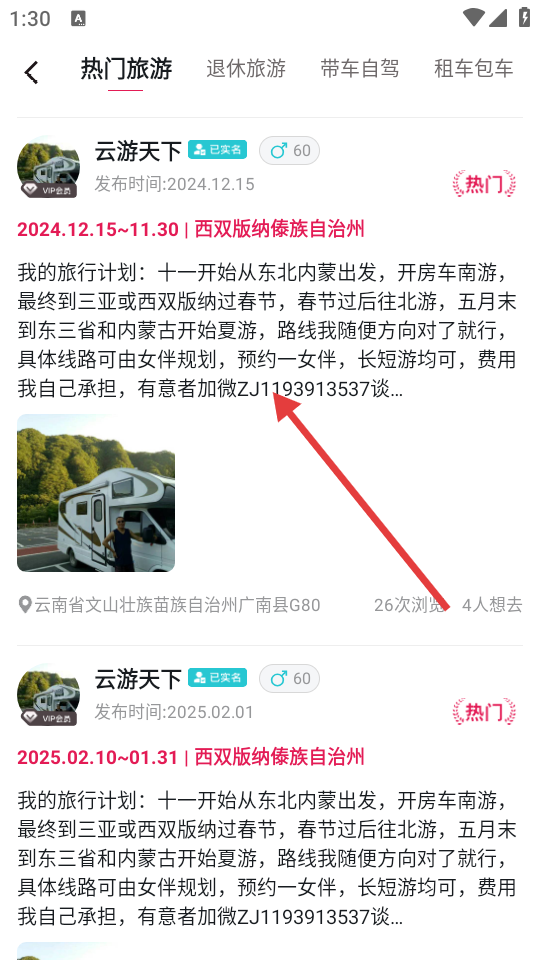 4、在热门旅游列表页面中,可查看如“云游天下”发布的西双版纳傣族自治州旅游计划等内容,了解详细行程信息。