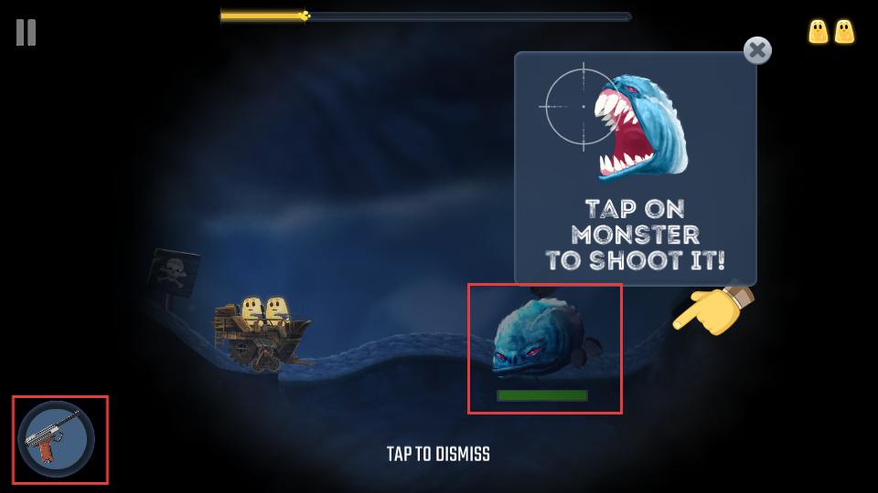 2、遇【蓝色怪物】点击射击,左下角武器辅助,辨怪物伙伴防误击。