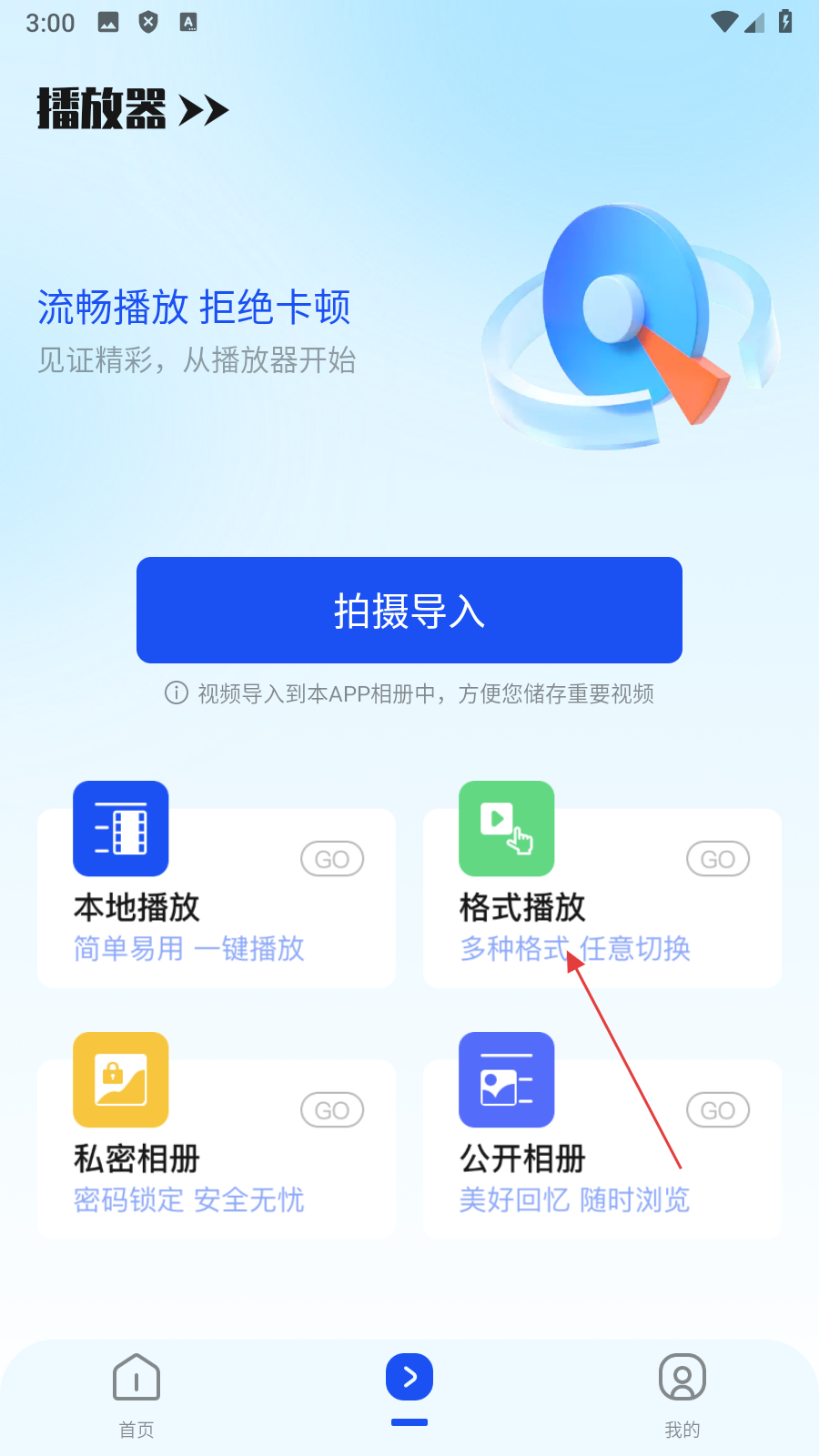 2、在播放器功能页面,点击【格式播放】,进入视频选择页面。