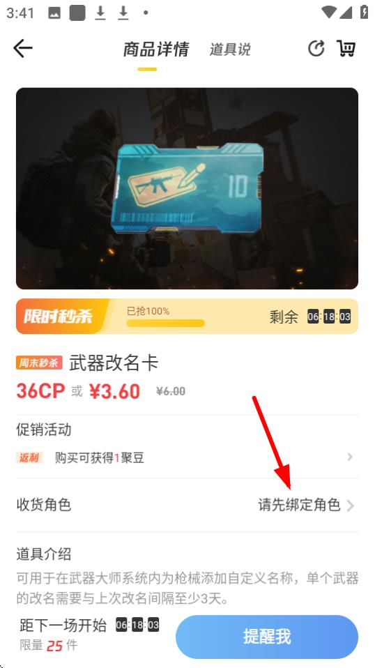 2、在【商品详情】页,需先点击【请先绑定角色】完成角色绑定。