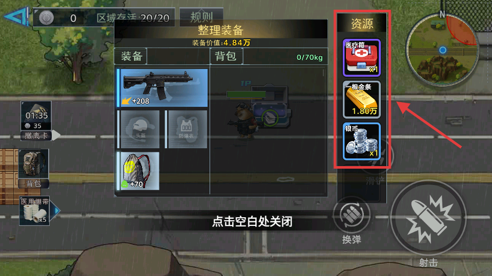 2、拾取【医疗箱】【金条】【银币】,医疗箱回血,金条银币强战力,合理分配背包。