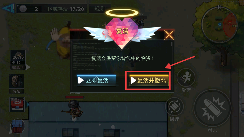 4、被击败后选【复活并撤离】保物资,或立即复活,依战况抉择延续资源。