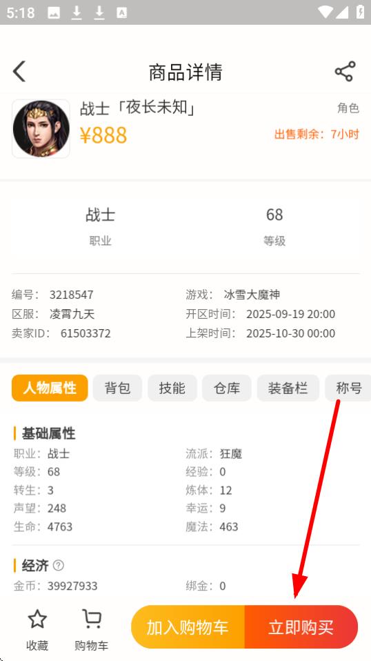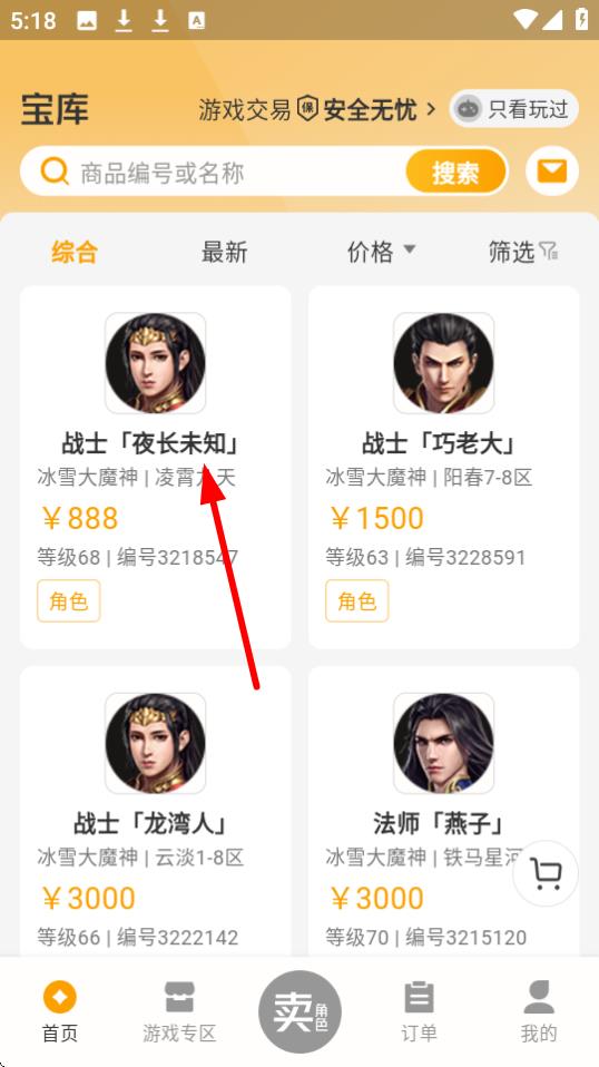 2、在【宝库】商品列表中,点击战士「夜长未知」可进入商品详情页。