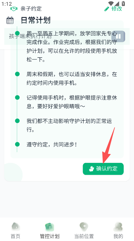 2、查看亲子约定,点击确认约定,明确使用规则。