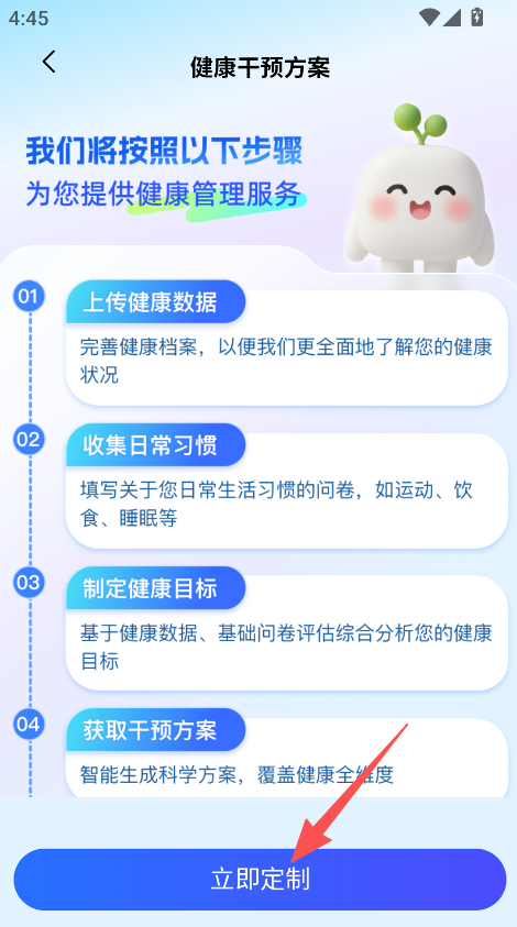 2、进入健康干预方案,点击立即定制,按步骤参与健康管理。