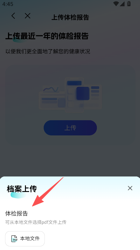 3、上传体检报告,从本地文件选择pdf,完善健康档案。