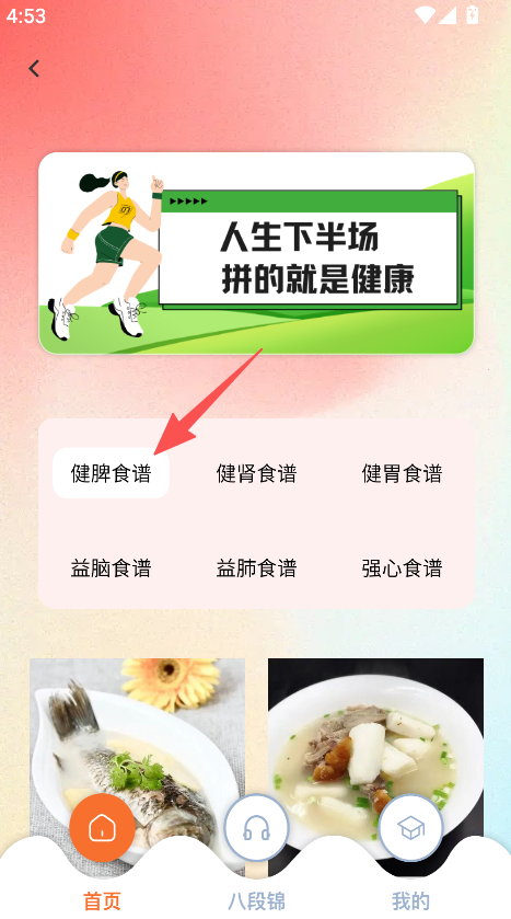 1、打开软件,选择食谱分类(如健脾食谱),进入详情页。