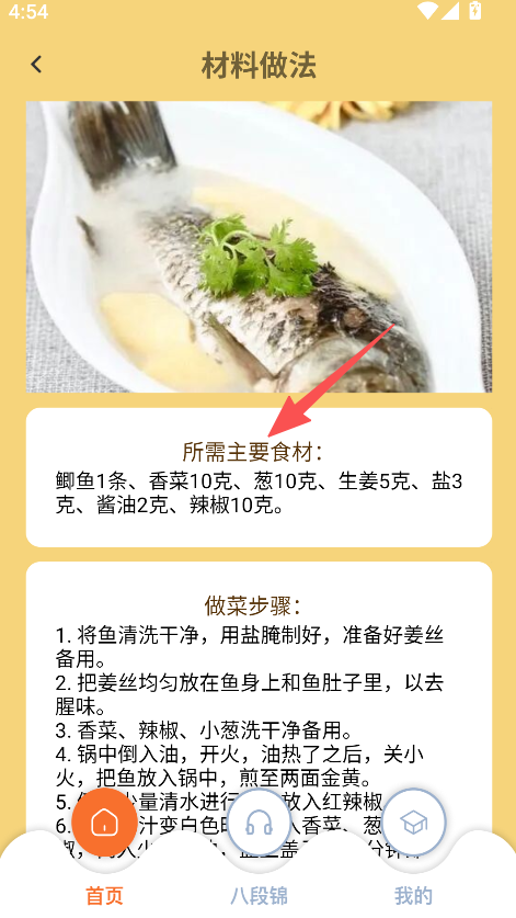 2、查看材料做法,了解所需食材(如鲫鱼、香菜等)和做菜步骤。