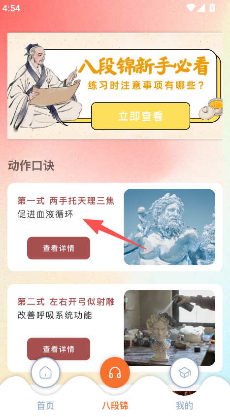 3、进入八段锦板块,浏览动作口诀(如第一式两手托天理三焦),查看练习详情。
