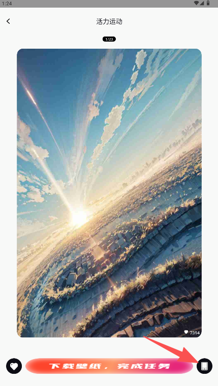 2、在详情页查看完点击底部“下载壁纸,完成任务”提示栏右侧的手机图标。