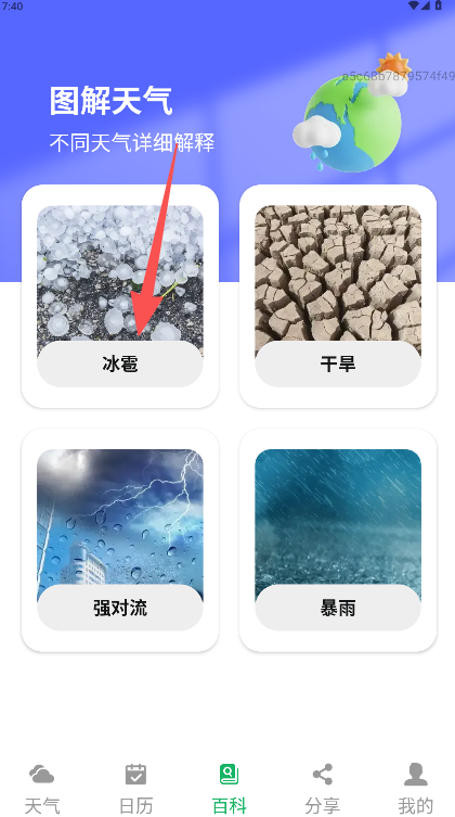 2、选择感兴趣的天气现象卡片,例如“冰雹”。